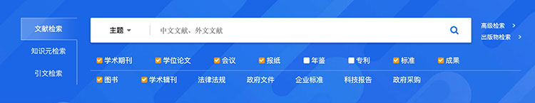平台检索涵盖的资源类型有:学术期刊、学位论文、会议、报纸、年鉴、专利、标准、成果、图书、学术辑刊、特色期刊。